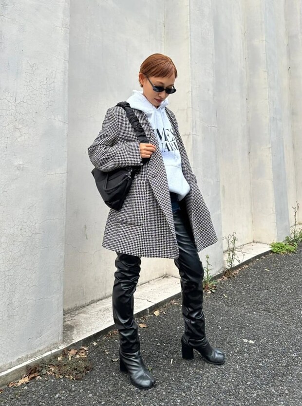 「エミのオリジナルカラーで織り上げたツイード素材のジャケットを主役にコーディネート。フーディ×ジャケットという今季らしいテイストMIXスタイルに、ヴィーガンレザー×デニムのバイカラーパンツでスパイスをきかせてカジュアルモードに仕上げました」