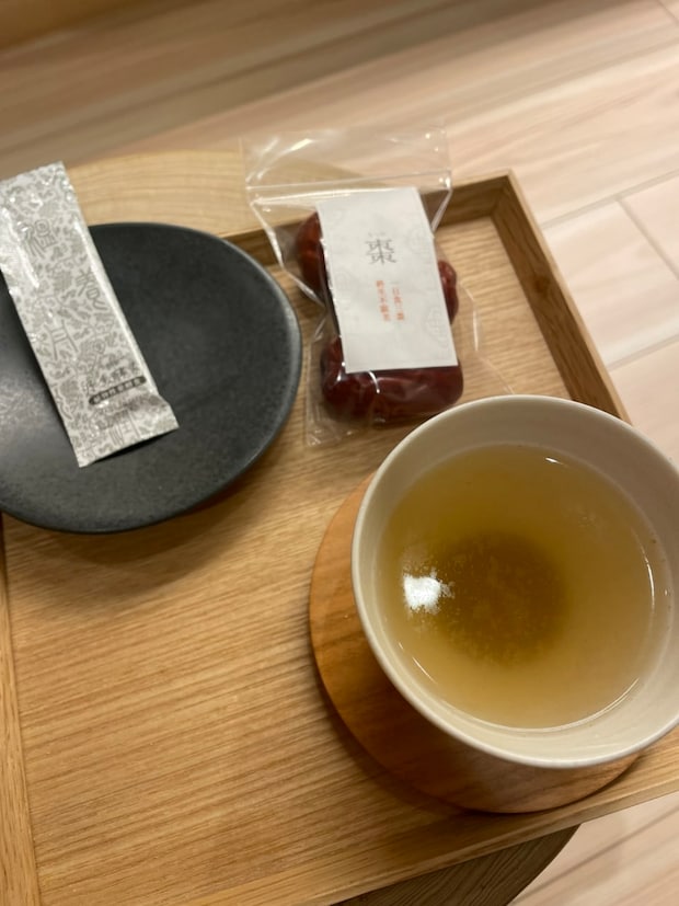 今回体験したのは、ご褒美入浴(¥11,000のコース)。薬膳茶と丹生酵素(ペースト)、そしてお土産の棗(なつめ)をいただきながらカウンセリングを受けました。