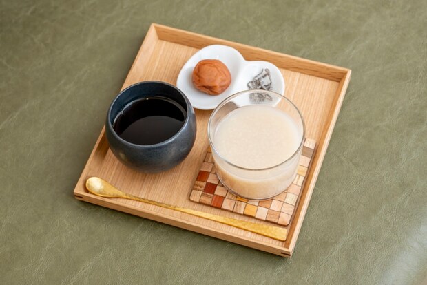 薬膳茶、甘酒、梅干しと塩昆布を。この甘酒と梅干しが美味しくて(涙)。帰宅時に購入しました。