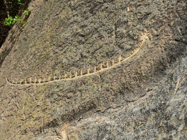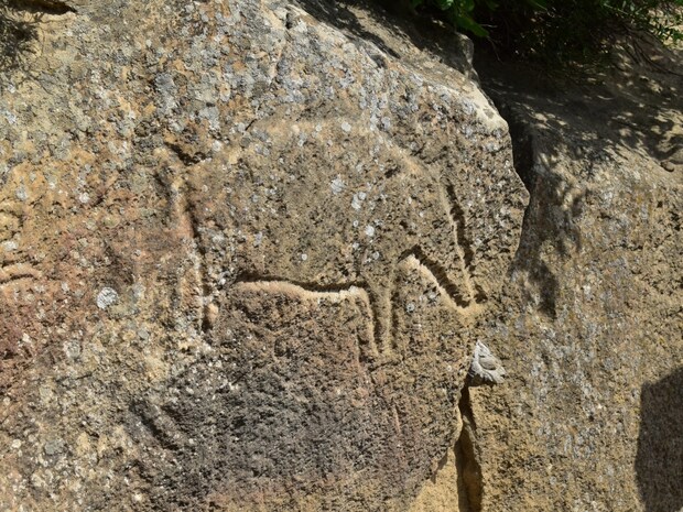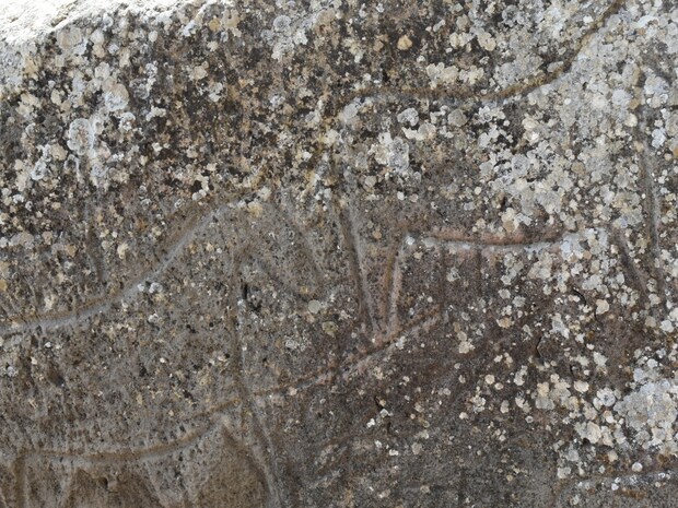 石室の西壁を構成する岩石には卍(スワスティカ)の描写も含まれています。卍は古代の宗教的信仰と結び付けられ、太陽と火を象徴しています。さらに、3本の指を持つ擬人像や、ヤギのペトログリフも見られます。