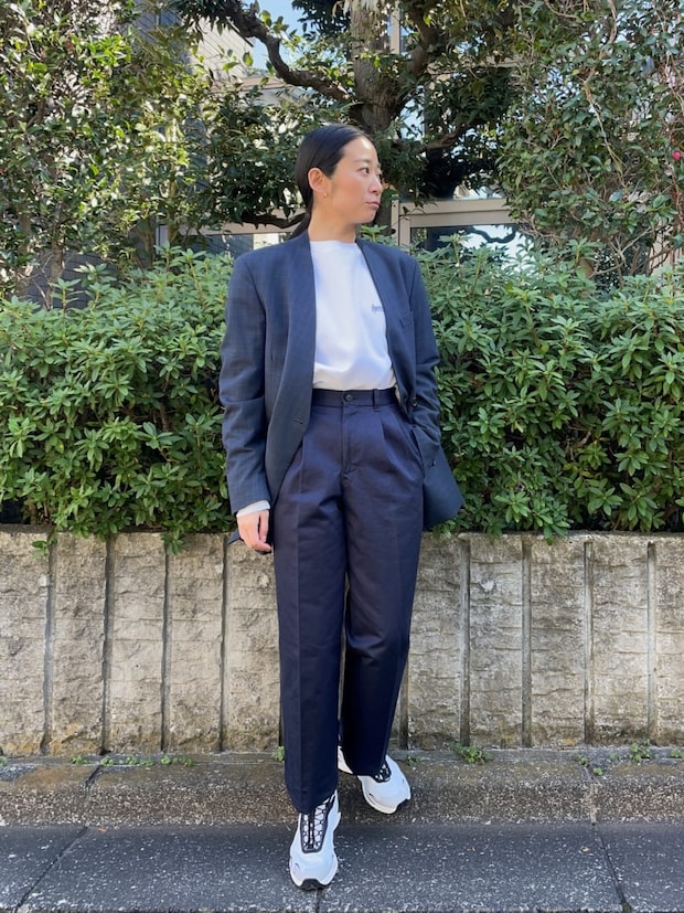 「スエット×チノパン×スニーカーのカジュアルスタイルをキレイめなノーカラージャケットでピリッと引き締めました。ブルックス ブラザーズ×ニートの別注のチノパンは、かためのクロスも相まって、カジュアル過ぎず、ラフに着ても品のあるスタイルに仕上げてくれてます」