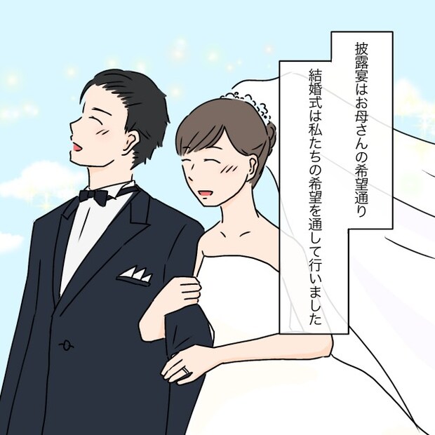 義母と揉めるのも、義母とユウタさんが揉めるのも嫌だったトモコさんは、結婚式の日程を変更するよう言う義母の意見に従うことにしました。義母を説得できずトモコさんに無理をさせていることを謝るユウタさんに、「我慢できなくなったら言うから。昔からだと難しいよね」と理解を示すトモコさん。ユウタさんは、結婚式後はもう実家に関わらないようにしようと言ってくれ、トモコさんは申し訳ないと思いつつもホッとしましたが、結婚式だけでこれほど義母と揉めることになりこれからのことを不安に思いました。その後、披露宴は義母の希望通り、結婚式はトモコさんたちの希望を通して無事に行われました。