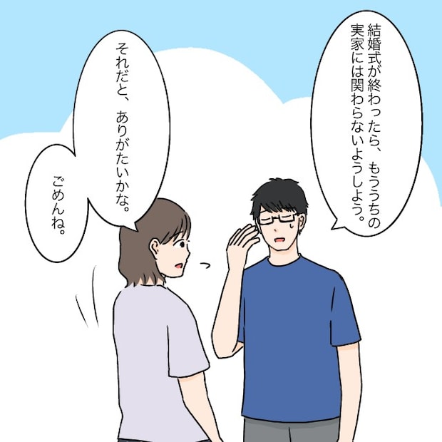 「結婚式が終わったらもううちの実家には関わらないようにしよう」と夫が言ってくれ、「それだとありがたいかな。ごめんね」と夫の言葉をありがたく受け取りました。