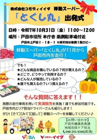 買い物に困っている高齢者などへの生活支援サービスとして期待される、コモディイイダと提携した移動スーパー「とくし丸」が、11月から埼玉県戸田市内で運行を開始する。