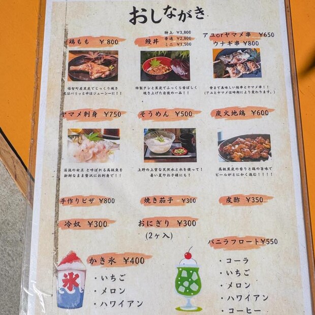 こだわりの鶏ももや炭火地鶏、鰻丼にヤマメ料理などもあります。