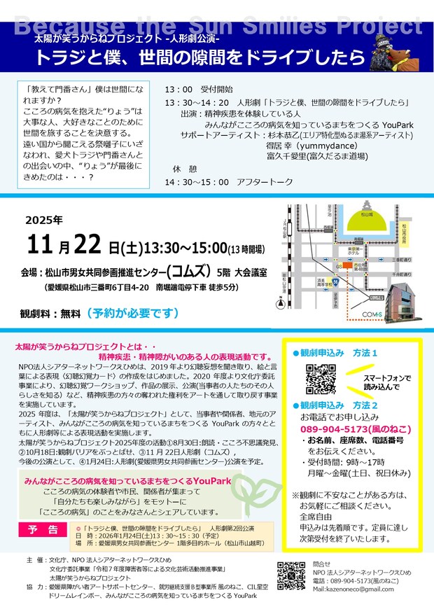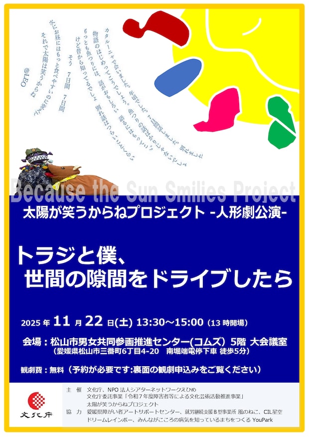 【主催】文化庁、NPO法人シアターネットワークえひめ(文化庁委託事業「令和7年度障害者等による文化芸術活動推進事業」太陽が笑うからねプロジェクト)