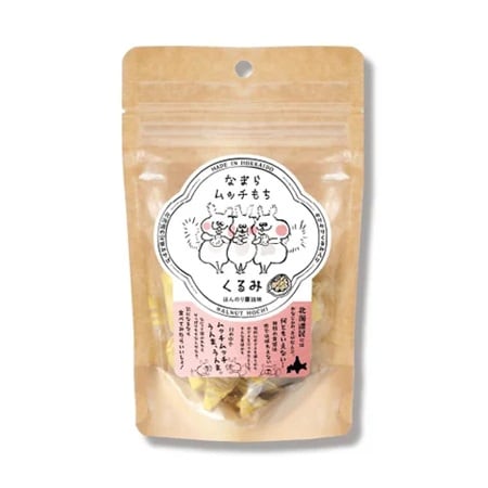 くるみ醤油×北海道銘菓「きびだんご」で、ぎゅーっと密着しているエゾリスさんのパッケージの「なまらムッチもち くるみ」は、ほんのり醤油味。