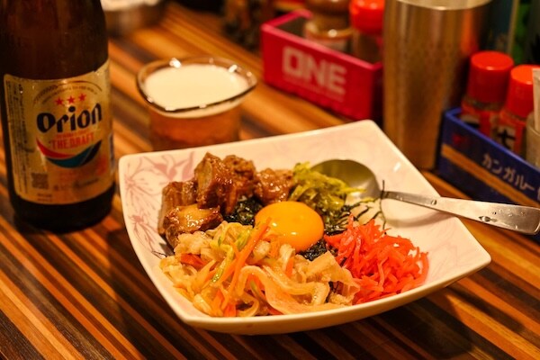 お酒が進むと、お腹が空く。そんなときにぴったりなのが「沖丼(おきどん)」。ラフテー、紅ショウガ、ゴーヤにミミガー…沖縄づくしの具材がごはんの上で踊っている。こんな豪快で自由な混ぜ丼、ちょっと他では見たことない。