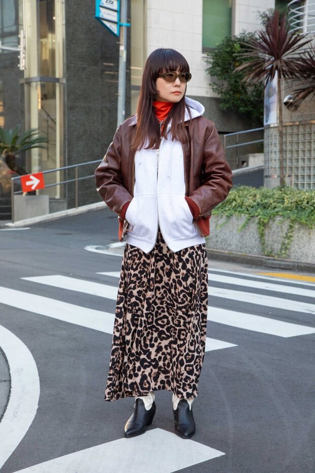 今っぽいレイヤードスタイルにヌケ感を与えてくれる、大柄なレオパード柄が洒落たスタイル! 個性的なアイテム使いにも負けない存在感も魅力のひとつです。