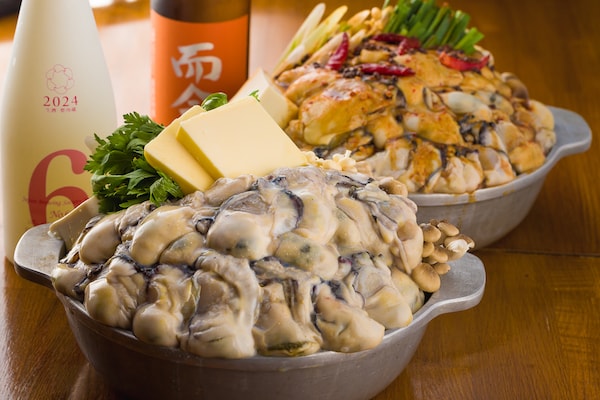 秋冬限定の「牡蠣鍋」の注文は、いずれも2人前から。単品での注文はもちろん、生牡蠣の食べ比べやカキフライも楽しめる全7品の「コース」1人5,400円(税込)の用意もある。+1,500円(税込)でスタンダード飲み放題プランもあるため、忘新年会にもぴったりだ。