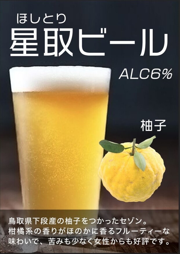 鳥取駅前サンロード内にあるビアパブです!鳥取県下段産のゆずを使ったフルーティーな「星取ビール」を販売。爽やかな香りが秋空にぴったりですよ!
