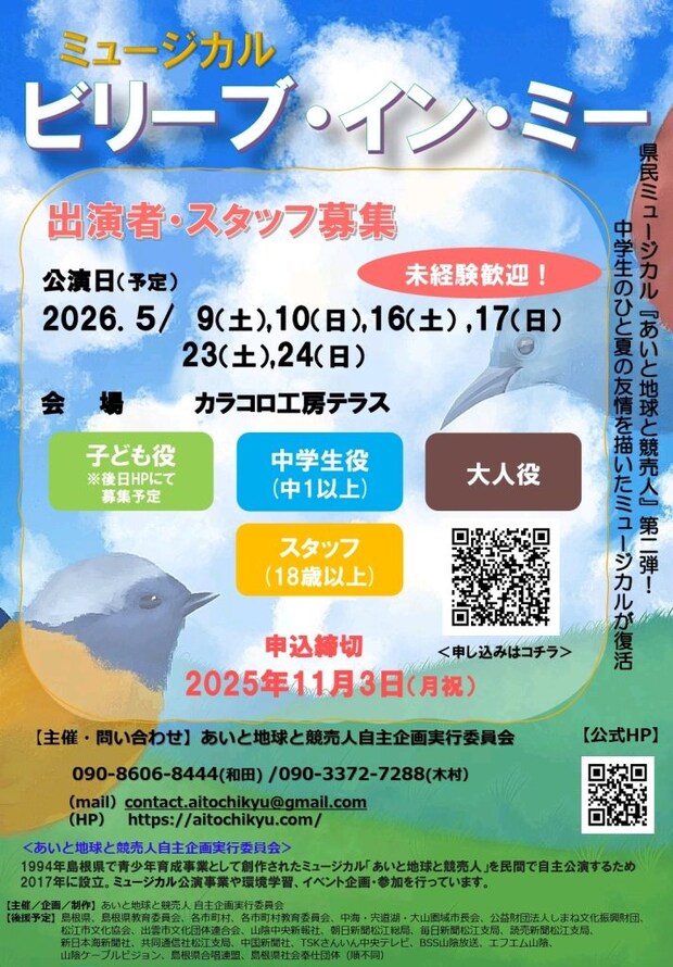公演日は、2026年5月。松江市のカラコロ工房テラスで行われる予定です。
