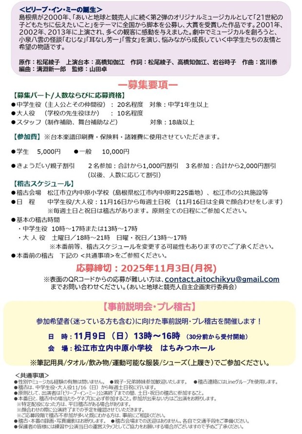 2000年に島根県のオリジナルミュージカルとして誕生したこの作品が、13年ぶりに松江市で開催されることになり、出演者やスタッフを募集しています。