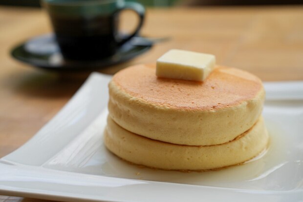 このパンケーキ、ベーキングパウダーを使わず、卵の力だけでふくらませているんです。