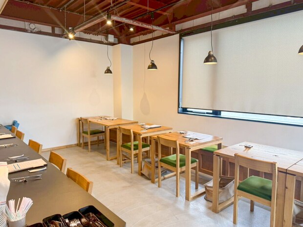 店内は、1人やカップルでも過ごしやすいモダンなカウンター席と、ファミリーや友人同士でわいわい楽しめる無垢材のテーブル席。