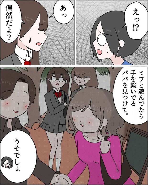 理解が追いつかず「えっ!?」と驚く私に、ジュリは「あっ。偶然だよ?ミワと遊んでたら手を繋いでるパパを見つけて」とその時の状況を説明してくれました。「うそでしょ」娘に目撃されてしまうような場所で浮気相手に会っていたなんて・・夫の軽率な行動に呆れてしまいました。
