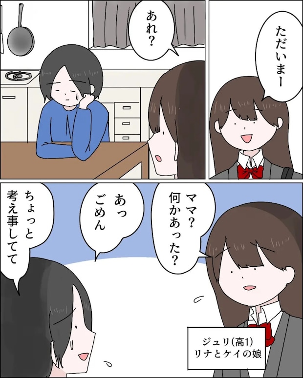 結婚して20年になる夫ケイさんから、浮気相手との間に子どもができたから離婚したいと突然言われたリナさん。夫の浮気に全く気付いていなかったリナさんはショックを受けつつも離婚を受け入れるしかないと考えますが、子ども達にどう説明すればよいのか頭を悩ませます。娘のジュリちゃんは「考え事をしてた」と言って元気のないお母さんを見て「パパのこと?離婚するの?」とズバリと言い当てました。リナさんが驚いて「何か知ってるの?」と聞き返すと、ジュリちゃんは少し前に偶然お父さんの浮気現場を目撃したと話してくれました。