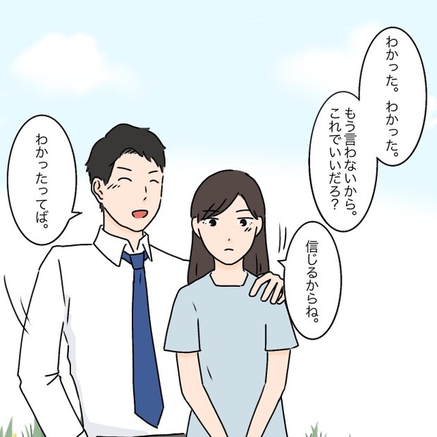 タケルは私をなだめ始めました。「わかったわかった。もう言わないから。これでいいだろ?」そう言って私の肩に手を回しました。本当はまだモヤモヤがおさまらなかったけれど、言いたい事は言ったし。「信じるからね。」と短く答えました。
