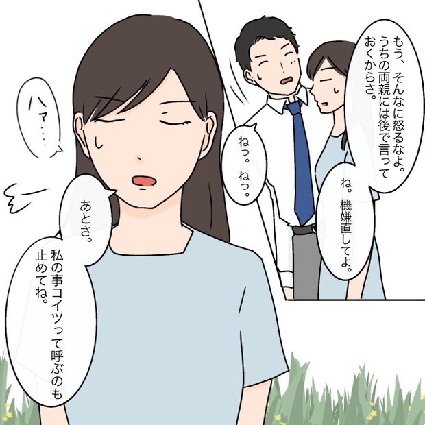 「もう、そんなに怒るなよ。うちの両親には後で言っておくからさ。ね。機嫌直してよ。」と言われ少し考えましたが、そんなに言うなら、と思いひとつため息をついて、「あとさ。私のことコイツって呼ぶのもやめてね。」すごく気になったあの呼び方。最初が肝心だからと思って言っておきました。