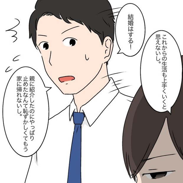 「これからの生活も、上手くいくと思えないし。」と覚悟を決めようとすると、「結婚はする!」とタケルは慌てて言いました。「親に紹介したのにやっぱり止めたなんて恥ずかしくてもう家に帰れないし。」って、結婚する理由はそこなの?
