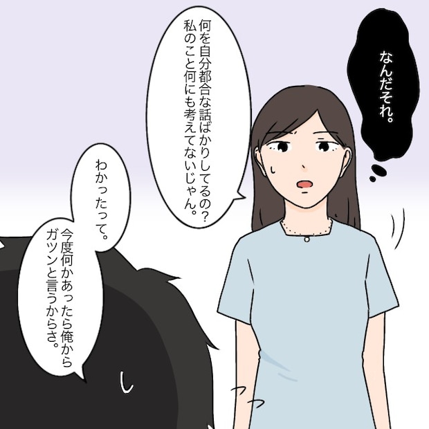 「何を自分都合な話ばかりしてるの?私のこと何も考えてないじゃん。」さっきから私の言いたいことが通じないタケルにイライラしながら言うと、「分かったって。今度何かあったら俺からガツンと言うからさ。」と、軽い感じでタケルは言いました。