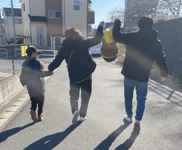 パパとママが末っ子を持ち上げて、その様子を次男が見ている写真。みんなが手をつないでいて、絵に描いたような幸せ家族の写真ですね。後ろ姿だけでも、家族みんなが優しい笑顔になっていることが想像できます。