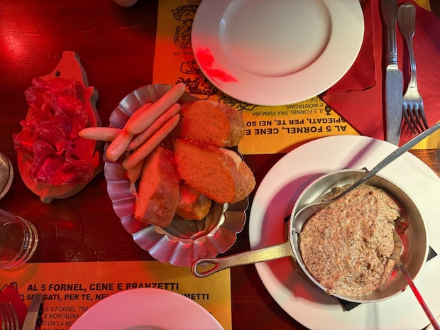 ベルガモにはポレンタの美味しいレストランがあり、生ハムや野菜の酢漬け、チーズの盛り合わせなどとセットになったアンティパスト(前菜)が大人気。