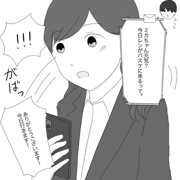 それはアツシくんからのメッセージで、「ミカちゃん元気?今日レンがバスケに来るって」と書かれていビックリ!!すぐに「ありがとうございます!今日行きます!」と返信しました。