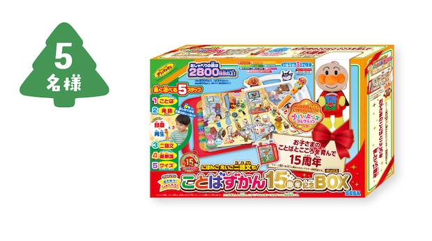楽しく遊びながらことばが学べる知育玩具。図鑑の絵をペンでタッチするだけで、アンパンマンのなかまたちがことばを教えてくれます。ペンのスイッチを切り替えると日本語がネイティブ発音の英単語になり、さらに二語文マークがあるページは、マークをタッチするだけで「えほん」・「かさ」という単語が「えほんをよむ」・「あかいかさ」といった二語文に切り替わります。ことばずかん15周年オリジナルデザインのプリちぃビーンズ★コレクション付きの特別仕様BOX。
