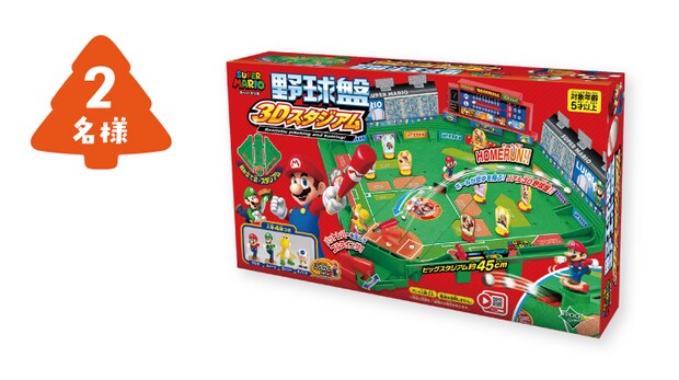 スーパーマリオの野球盤が組み立て式になって登場! コンパクト収納で片付けが簡単に! 3Dピッチング機能搭載! リアル投球アクション、直感バッティング機能でより臨場感のある野球を楽しめるようになりました。マリオキャラクターのフィギュアが4体付属します。