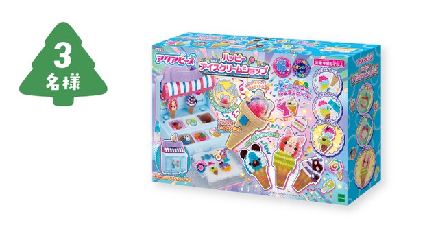 「アクアビーズ」は水でくっつく不思議なビーズ! お絵かき感覚でカラフルなビーズをならべて作品作りを楽しみましょう! 「ハッピーアイスクリームショップ」は、アクアビーズを使ってアイスクリーム屋さん気分が楽しめる楽しいセット。平面はもちろん、立体のアイスも作れ、ショップ型のケースには作品を飾れるなどお楽しみがいっぱい!