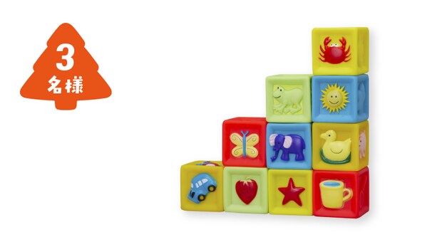 赤ちゃんの初めての積み木にピッタリの、柔らか素材の積み木10ピースセットです。音のなる仕掛け、可愛いイラスト、ポップな色合いなど、楽しい工夫がたくさん。表面に凹凸があるので、力の弱い赤ちゃんでも持ちやすく、柔らかい素材でできているので、小さなお子さんでも安心です。