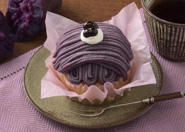 濃厚な甘みとねっとりした食感が特徴の沖縄県産紅芋を使ったモンブラン。たっぷり絞った紅芋あんの濃厚な甘みと、爽やかな味わいのチーズクリームの組み合わせが楽しめる。土台に絞ったまろやかな甘みの黒糖入りカスタードと、上面に飾ったかのこ豆がアクセントになっている。
