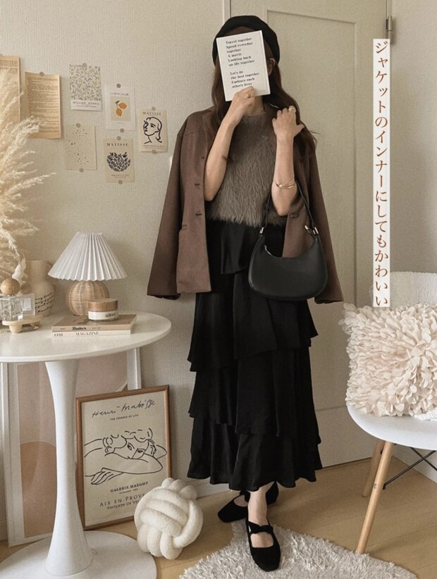 こちらは、フェザーヤーンベストに同系色のジャケットを羽織った、大人ガーリーな着こなし。ボリュームのあるベストに、黒のロングティアードスカートを合わせることで、甘すぎない落ち着いたバランスに仕上がっています。リボンつきのバレエシューズやレザーのミニバッグ、ベレー帽といった小物類も黒で統一しており、上品でフレンチシックな雰囲気をプラス。防寒とおしゃれを両立できる、晩秋から冬まで大活躍まちがいなしのコーディネートです。