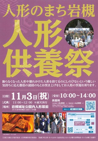捨てられない人形などを供養する「人形供養祭」が11月3日(月)、埼玉県さいたま市岩槻区の岩槻城址公園 人形塚および黒門周辺で行われる。