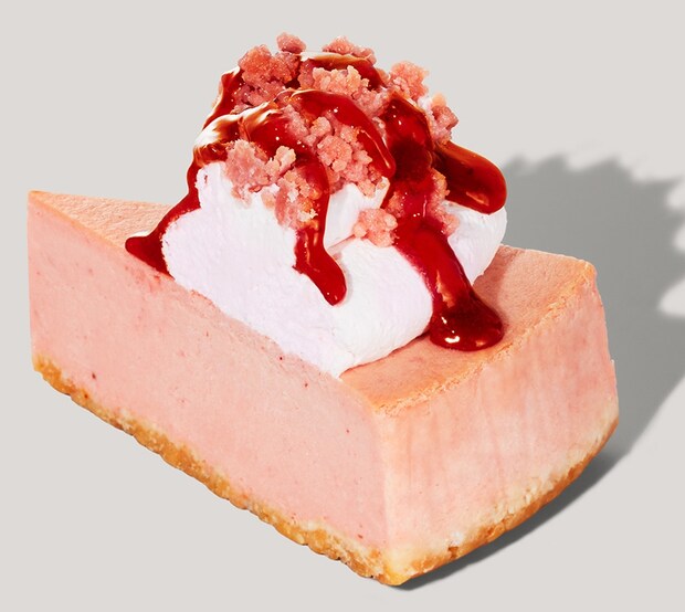 ストロベリー風味のなめらかなベイクドチーズケーキに、淡いピンク色のストロベリーホイップクリームをのせ、ストロベリーソースとクランブルをトッピングした。価格はテイクアウト570円、店内580円(各税込)。