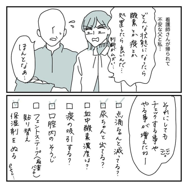 それでもヘルパーや看護師、医師などたくさんの人に支えられながら続けてきた介護。日々母の容態の変化を目の当たりにしているからこそ自然と「最期」について覚悟をします。