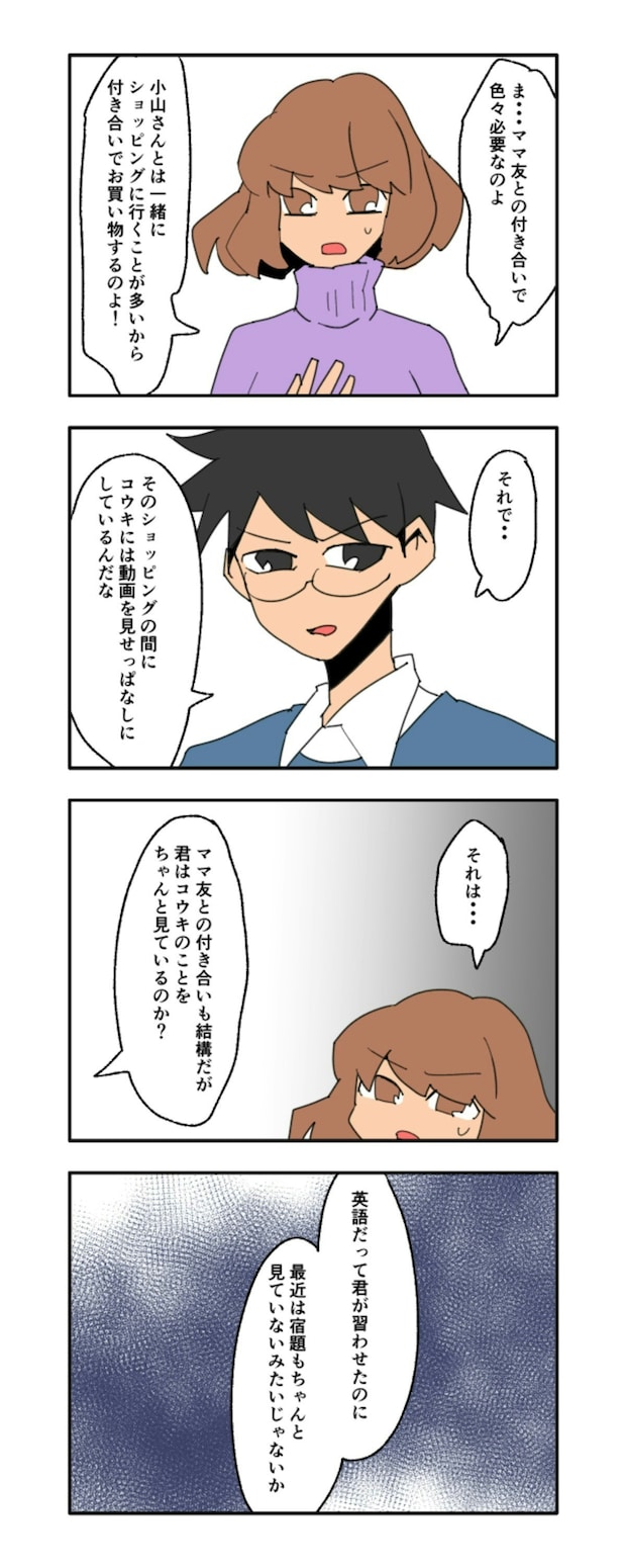 ハルミは、小山さんとのショッピングについて「付き合いで買い物をしているだけ」とごまかしていました。しかし、夫からは「ママ友を優先して、息子のコウキの世話をおろそかにしているのではないか」と指摘されてしまいます。