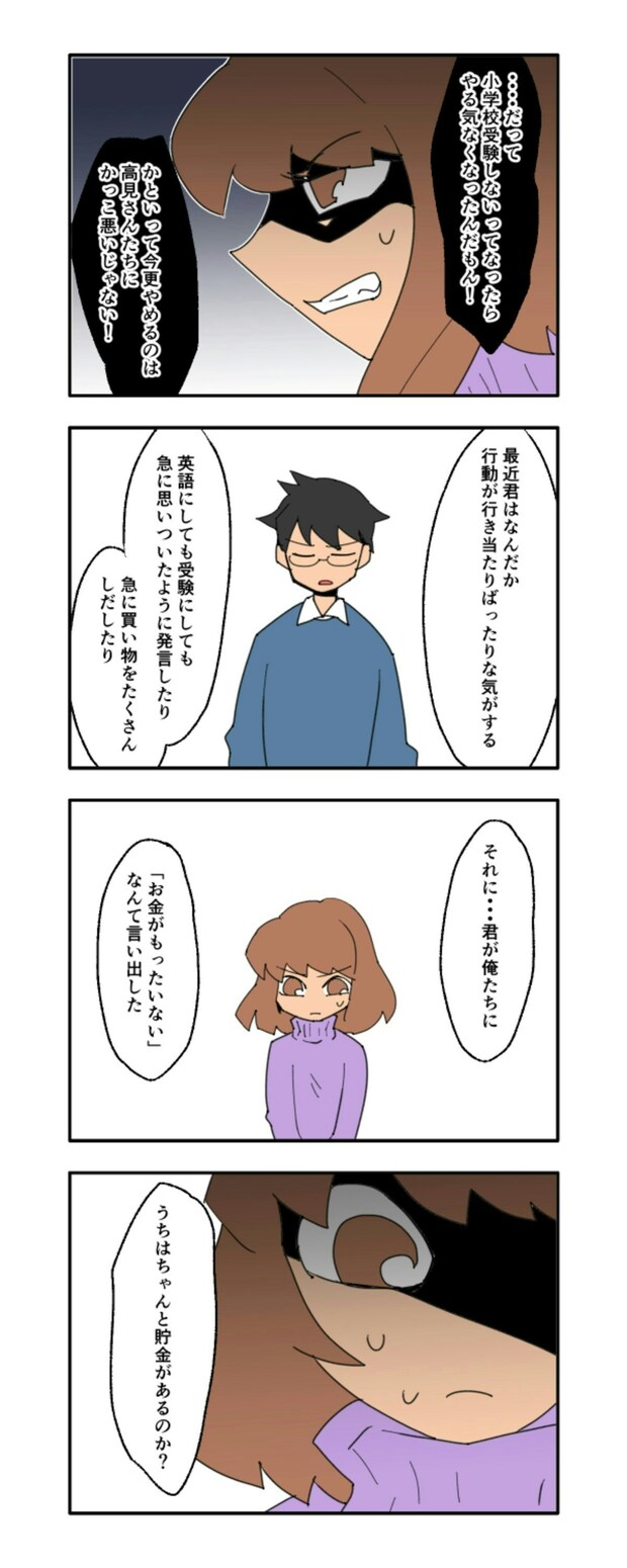 ハルミは夫のコタロウに、「ただ付き合いで買い物をしているだけ」と言ってごまかしました。しかし、コタロウはそれだけでなく、ハルミが英語の宿題を見ていないことや、最近の言動が思いつきでおかしいと指摘します。さらに、貯金があるのかどうかも確認しました。