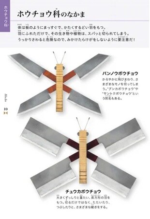 84種類ものチョウが登場する『超チョウ図鑑』では、全ての超チョウを「ホウチョウ科」「テチョウ科」などに分類し、その生態についても紹介している。