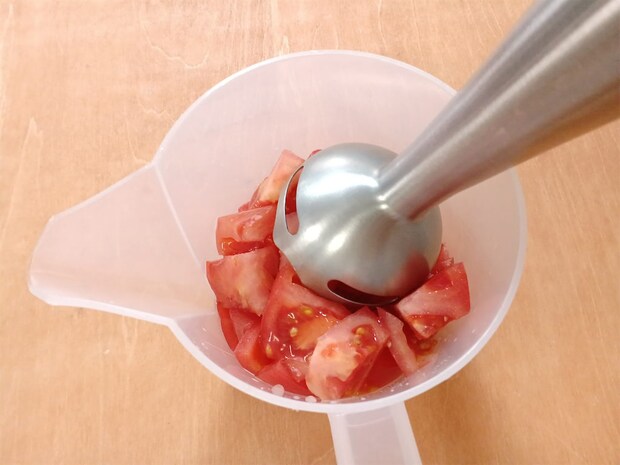 1. トマトをブレンダーで撹拌したら、鍋に移して中火にかける。