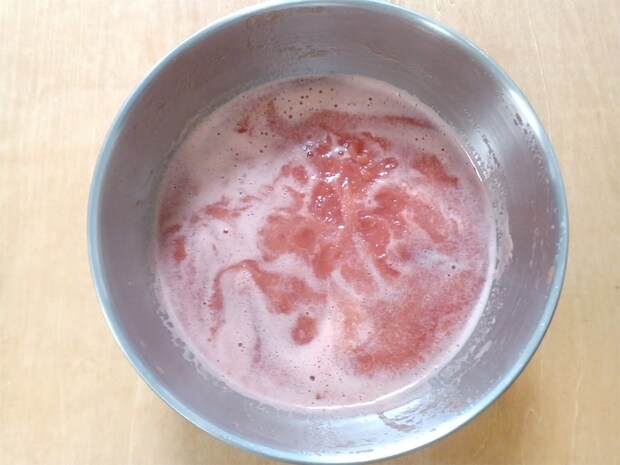 米の分量に合わせて、トマト汁の分量は調整してください。今回は炊飯器の2合目より若干少な目にしました。
