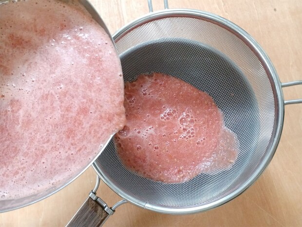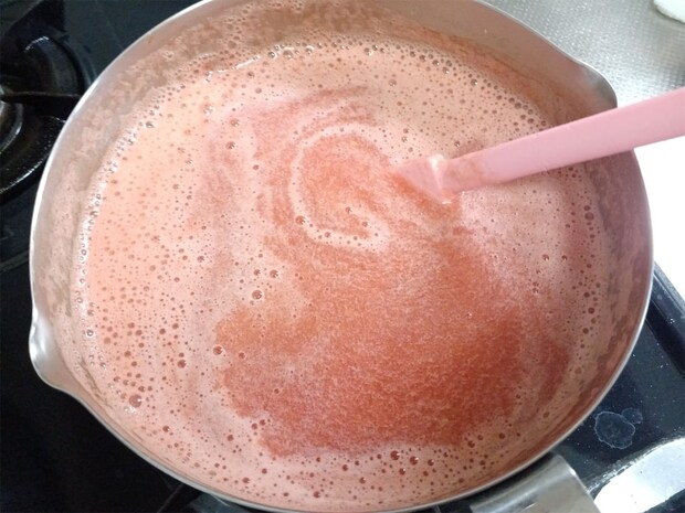フツフツするまで火にかけます。加熱することで裏ごししやすくなります。