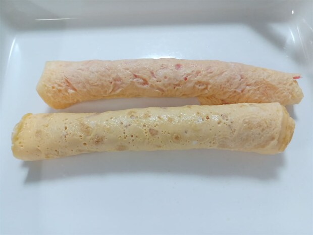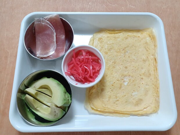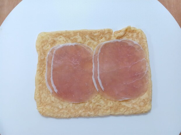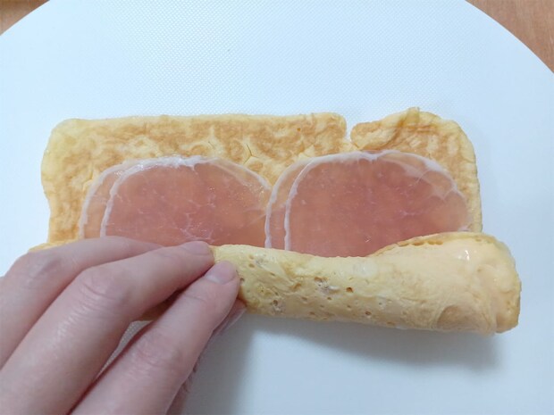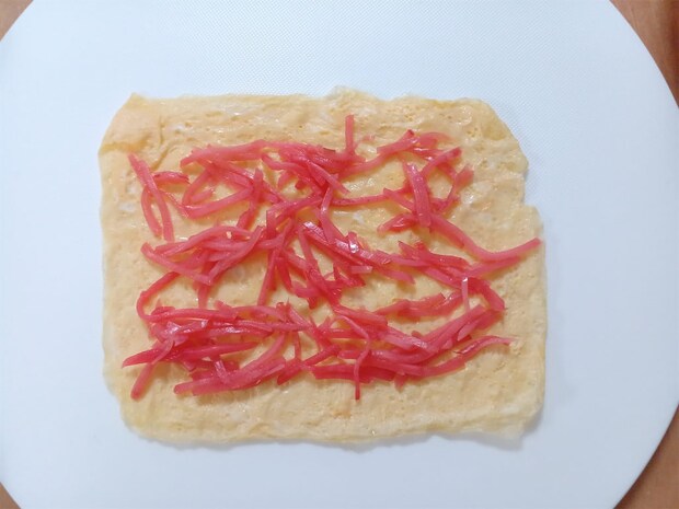 6. 薄焼き卵に生ハムと紅しょうがをそれぞれのせて、くるくる巻く。