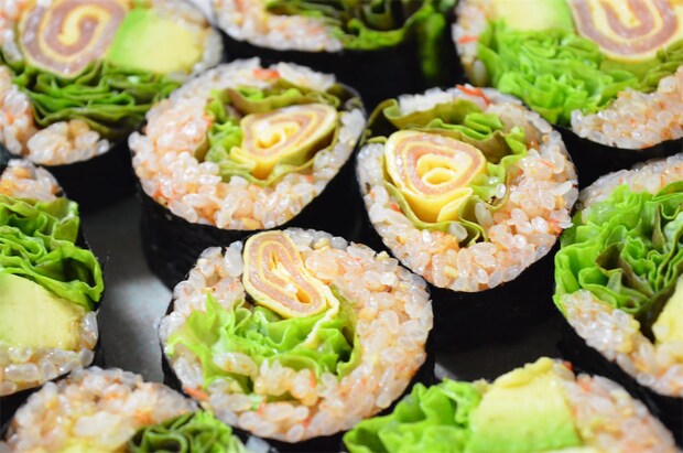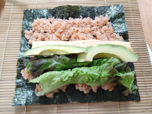 7. すしのりの上に4のすし飯をのせ、6とサニーレタス、アボカドをのせて巻く。