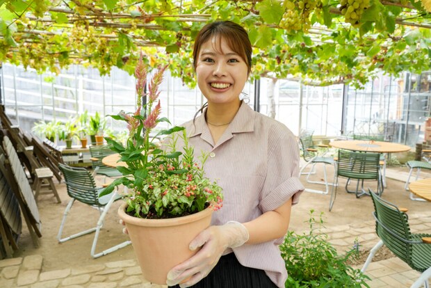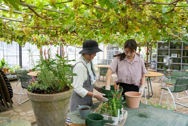 ブドウの木に囲まれたハウスの中では、鉢植え体験や苔テラリウムづくりが楽しめます。