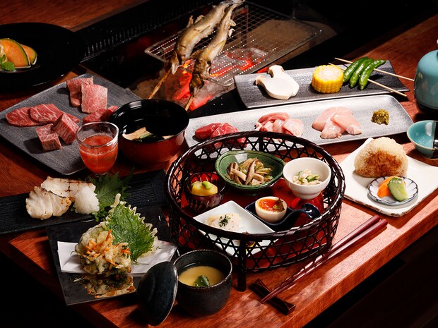 夕食は、鳥取和牛やヤマメなど、地元の恵みを活かした料理が並びます。
