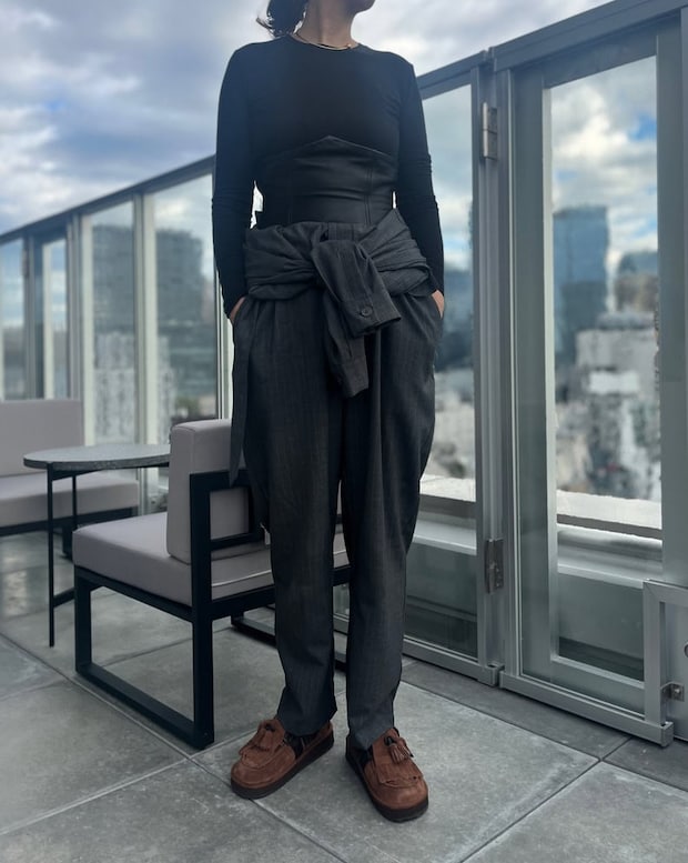 クルーネックも何色か買う予定ですが、まずは定番の黒を購入してみました。すごく首がつまっているのでインナー感は一切なく、薄手のカットソーのように見えるのがイイでよね。1枚で着てもよかったんですが、今回はスタイリングがラフだったのでレザーのコルセットをプラスしてみました。そしたら質感が異なるので同色合わせでもポイントになりますし、スタイリングの洒落度アップにもかなり貢献してくれたと思います。