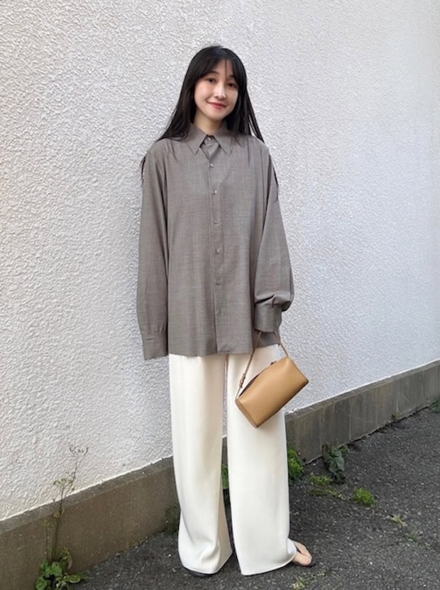 リラックス感のあるシャツとのワンツーコーデを仕上げるのは、ドレープが美しいザ・ロウのパンツ。さらにフォーマル感を高める、同ブランドのバッグが引き締め役に!