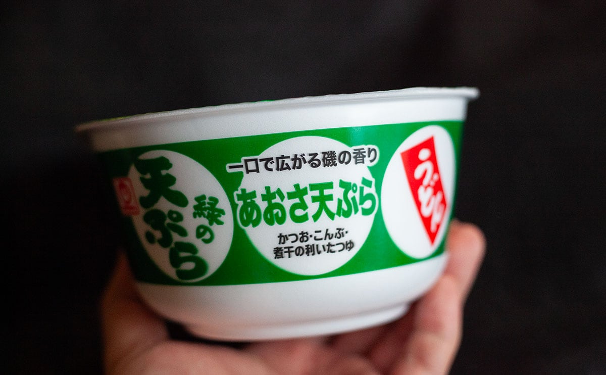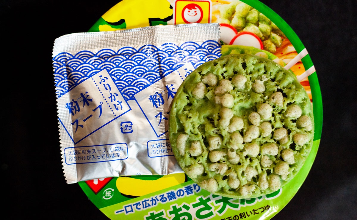 同商品のつゆは、かつおと昆布、煮干しのだしがベース。ここまでは一般的なカップうどんですが、天ぷらにあおさが混ぜ込まれていて、さらに別添のあおさふりかけまで付いているようです。